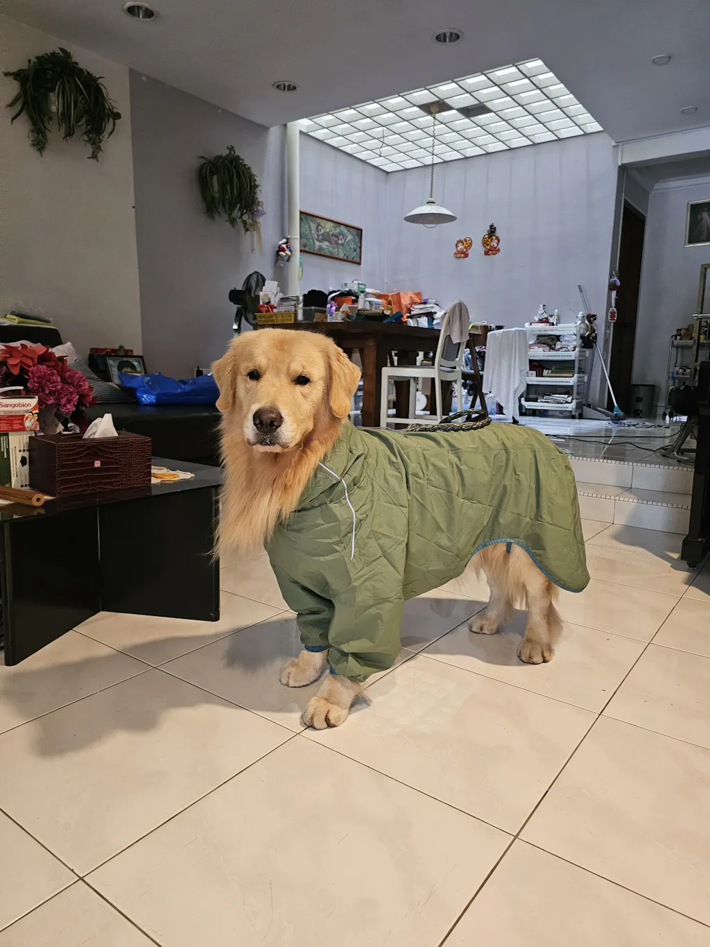 Doggies who wear harnesses have the opening on the back of the raincoat for leash to access the harness. Raincoat comes with fully taped seams. Elastic (foot) loops help to keep extra large hind flaps in place whenever dog is in full action. The raincoat secures via a zipper along the length of the torso, and coat is unlined but comes with wind foil underneath.