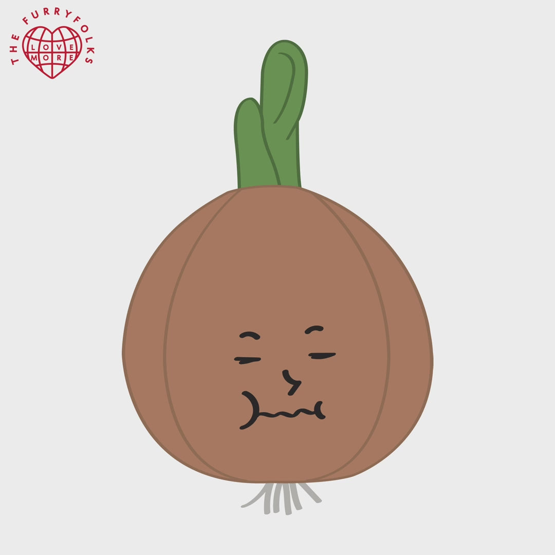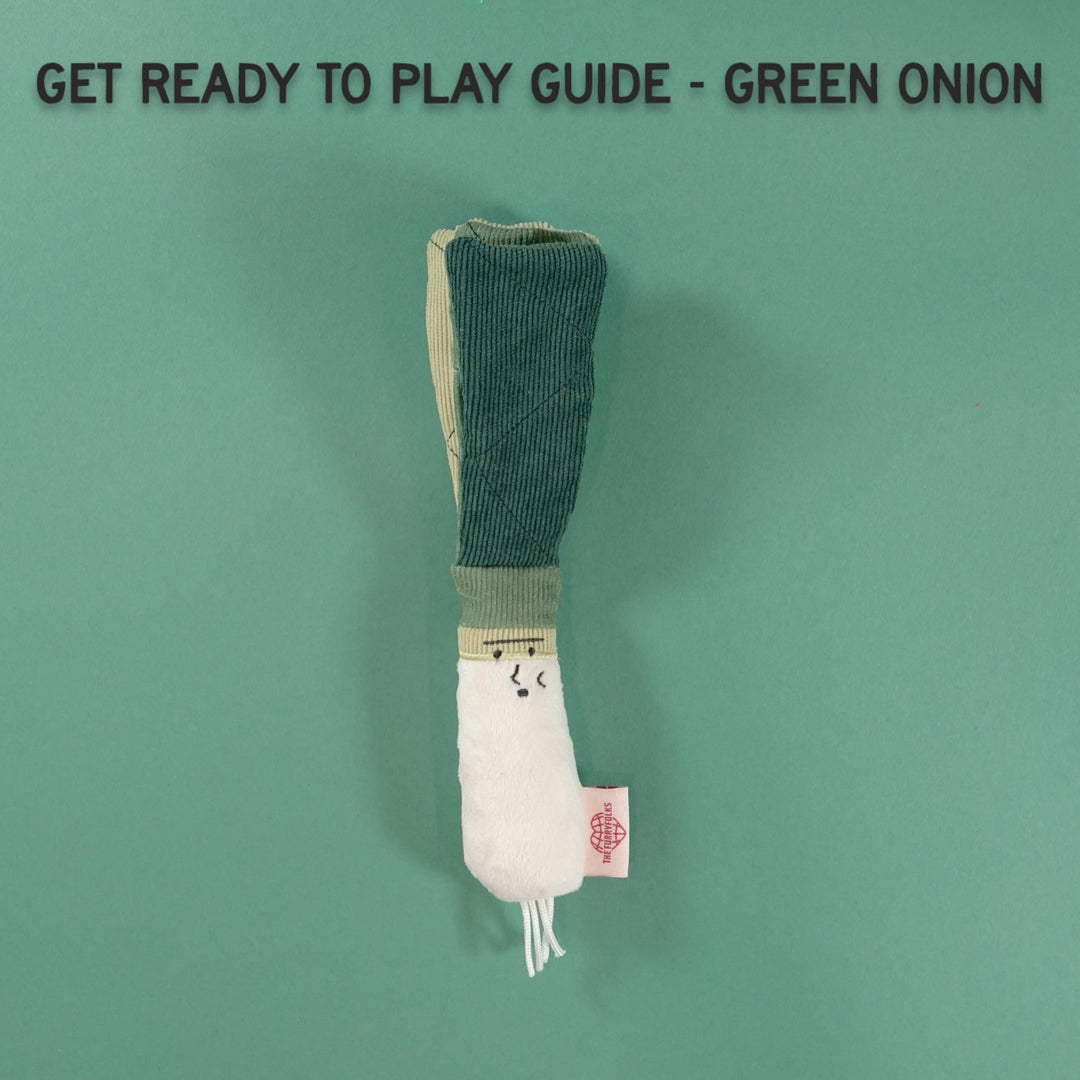 For an added element of excitement, a squeaker is placed inside the white stem of the onion, and crinkle paper is inside the green leaves.